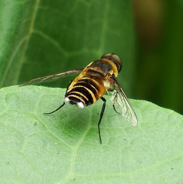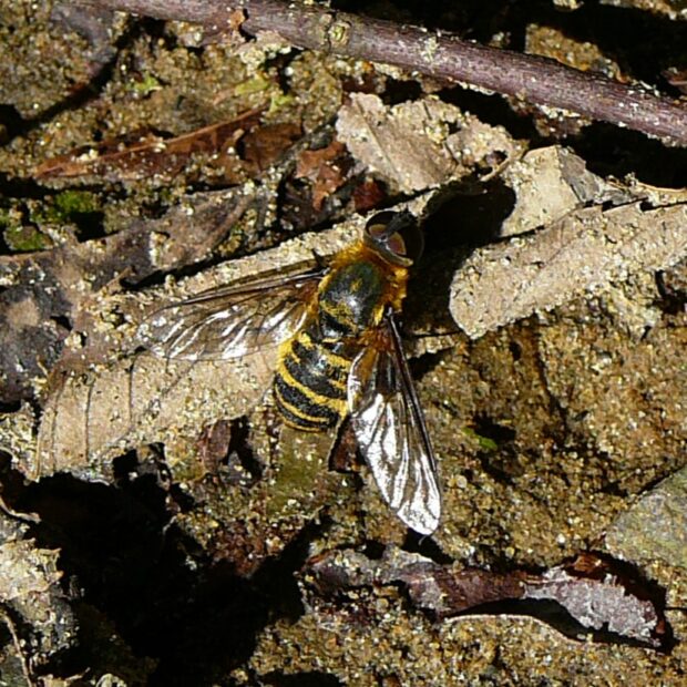 地面近くを飛んでいることが多いツリアブの仲間。 メスは、 産卵に備え、 卵を砂粒で覆い隠すために、 地面の土にお尻をこすりつけるような行動をとります(尾端接触行動)。