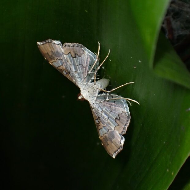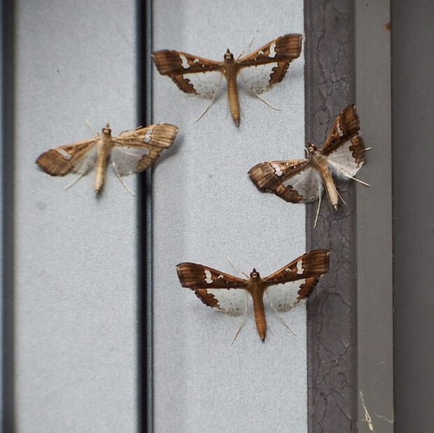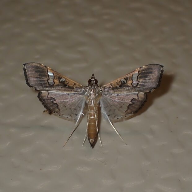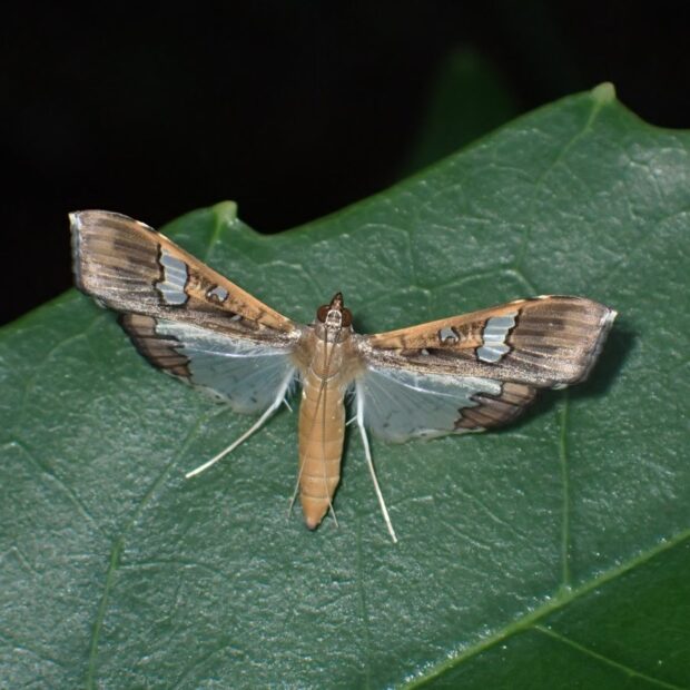 ツトガ科ノメイガの仲間。 幼虫はマメ類を食べます。 昼間に、 草地、 人家周辺で普通に見られ、 秋に増えます。 反り返るようなとまり方に特徴があり、 はねの表と裏の両方を観察することができます。