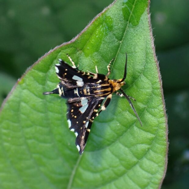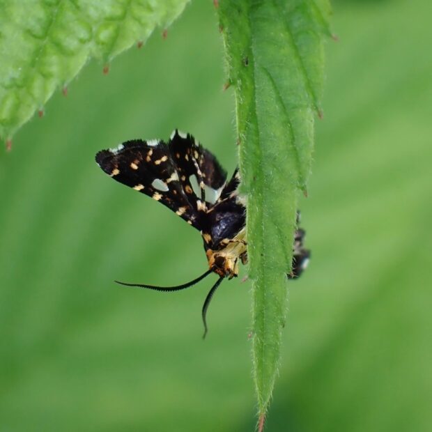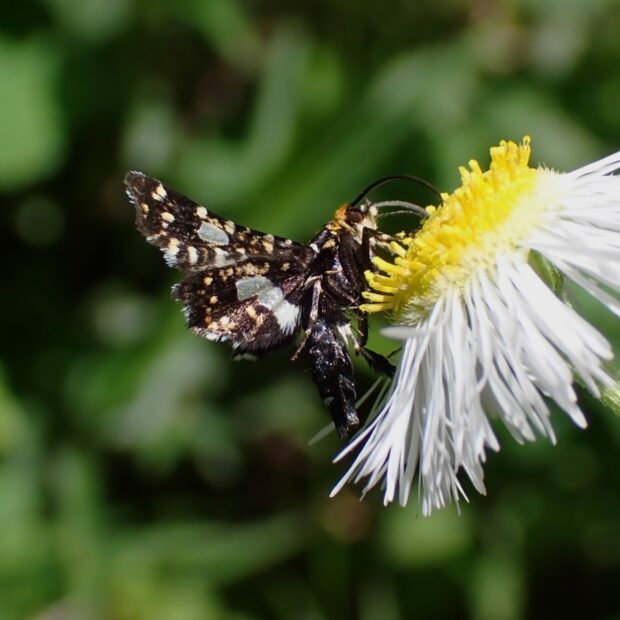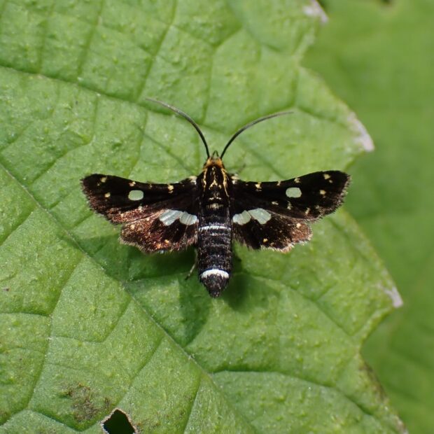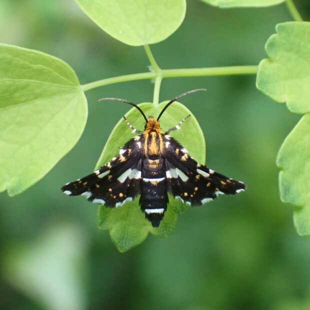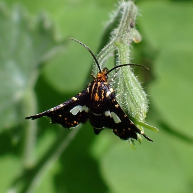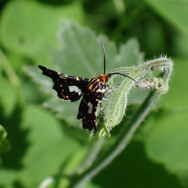マドガ科の仲間。 黒いはねに、 半透明の白い紋と黄色い点々がある小さなガ。 はねの白色の紋を窓に見立てて名前がつけられました。 日中に飛び回り、 葉の上や花で見られます。