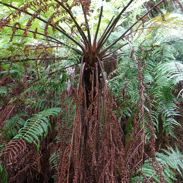 見た目は木ですが、 幹は不定根が集まってできたもので、 年輪をつくる成長(肥大成長)をしません。 このことから木ではなく「木生シダ」として分けられています。 また、 太古から生えているイメージが強いですが、 実際に繁栄し始めたのは恐竜が絶滅する前の白亜紀くらいで、 比較的新しいグループのシダだったりします。