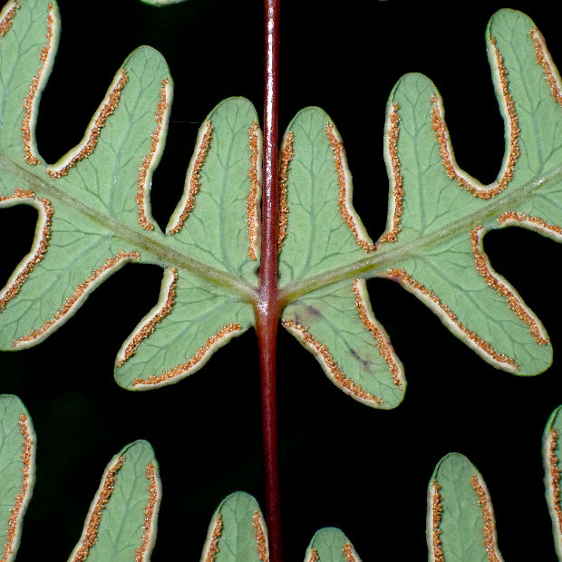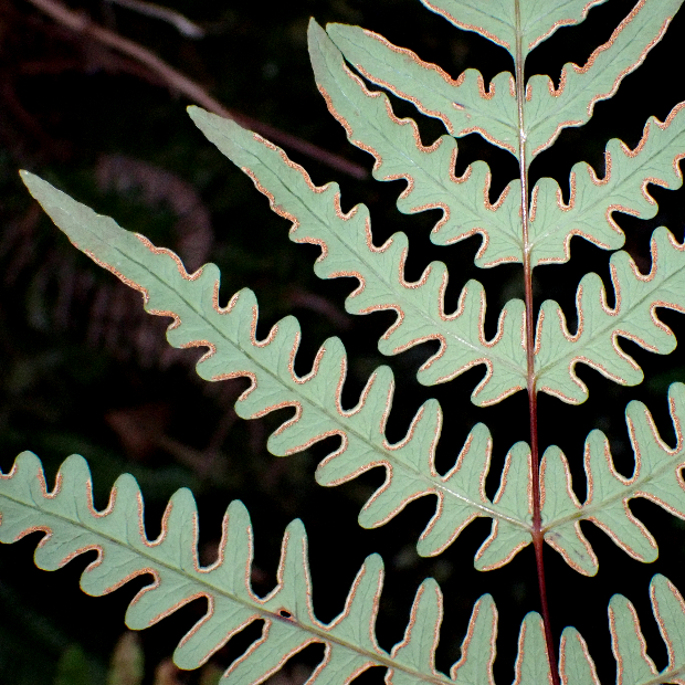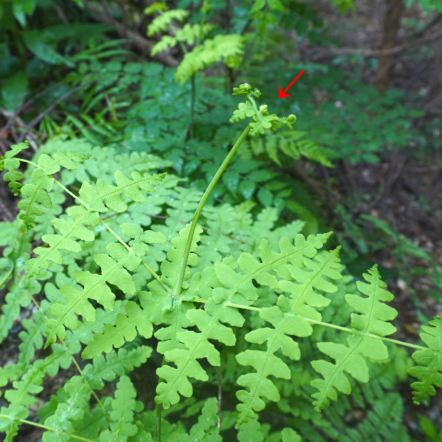 暖かい地域の温泉近くなどに生える大きめのシダ。 ワラビに近い仲間で少し似ていますが、 葉はやわらかくて切れ込みは幅広く、 葉柄や葉軸は赤色っぽいです。 日本での分布は限られますが、 屋久島や三宅島など場所によってはよく見られます。