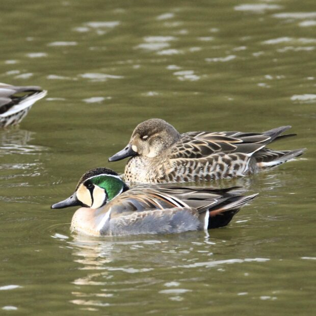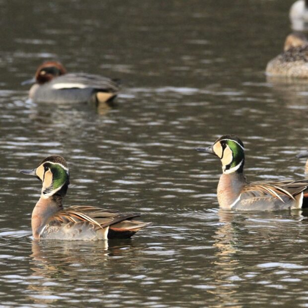 オスの顔には独特な模様があり見分けることは簡単です。 メスは嘴の根元に白い班があるため他のカモ類と見分けることができます。