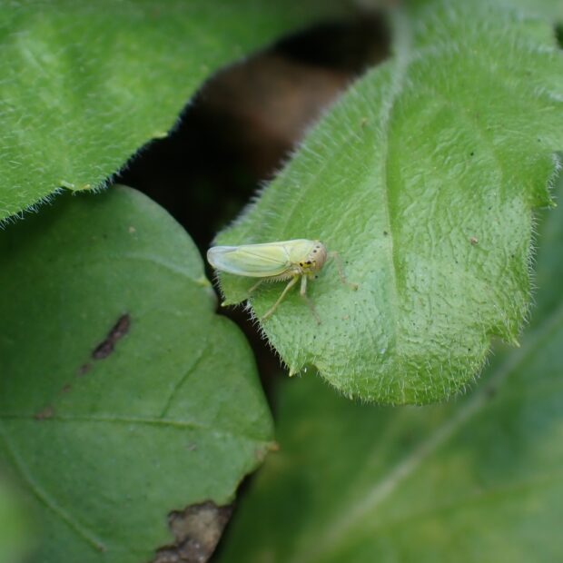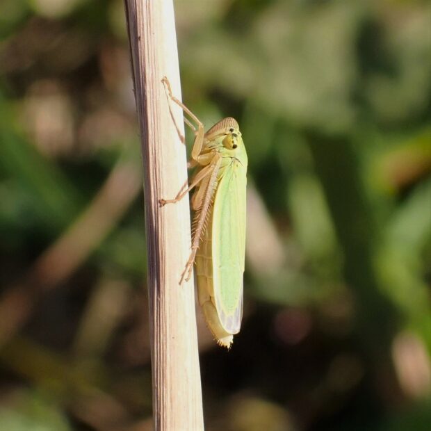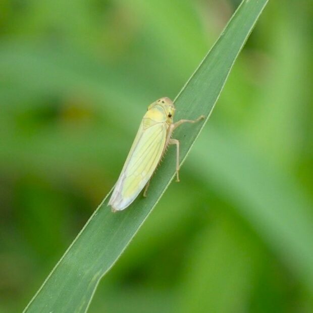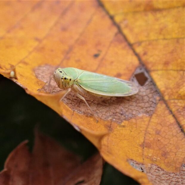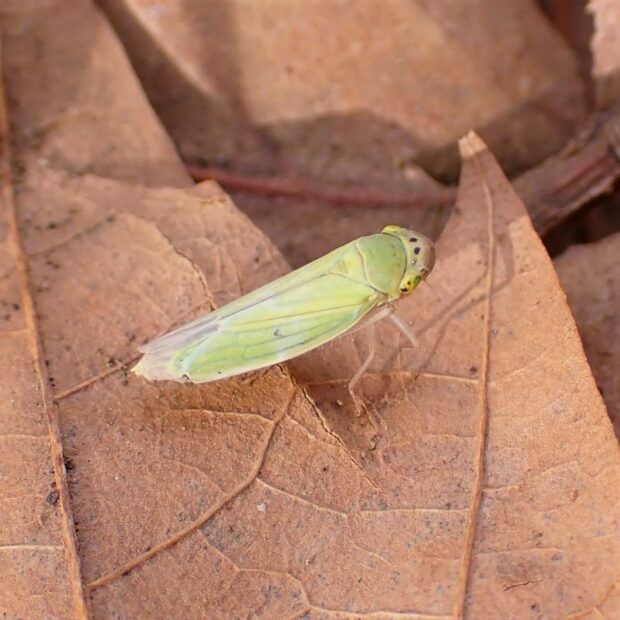 頭に黒い点々があるヨコバイ。 草はらで普通に見られます。 危険がせまると、 はねて逃げます。
