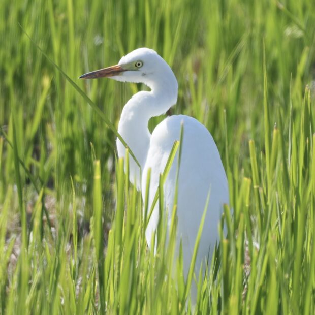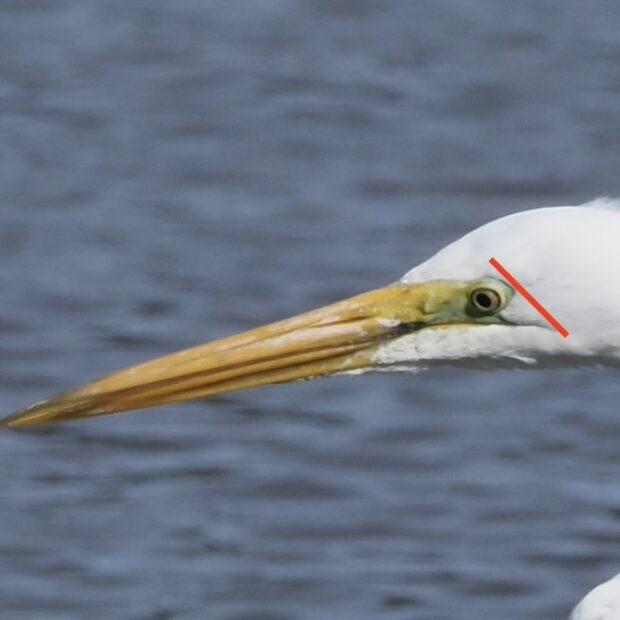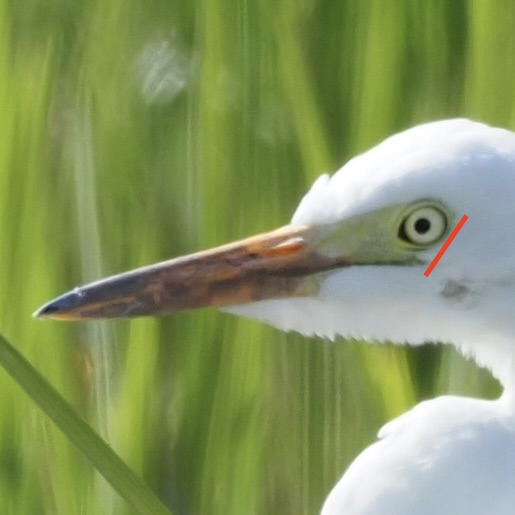 見た目が似ているダイサギとは、 嘴が短く、 目の下の線が短いことで識別することができます。