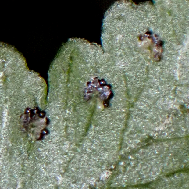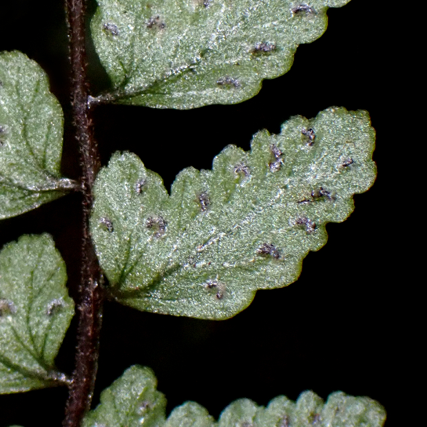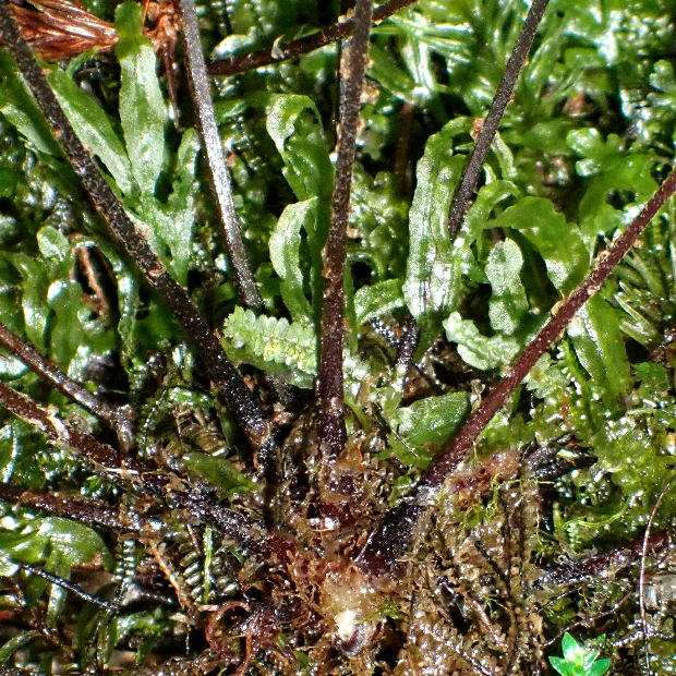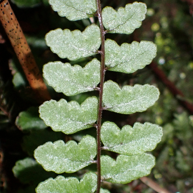 日本では屋久島と、 近年になって和歌山県でも見つかったシダ。 湿った斜面から紫色を帯びた葉を多く垂らします。 その姿は美しい鳥の尾羽のようです。 葉裏には、 カマ状に曲がった小さめの胞子のう群をつけます。
