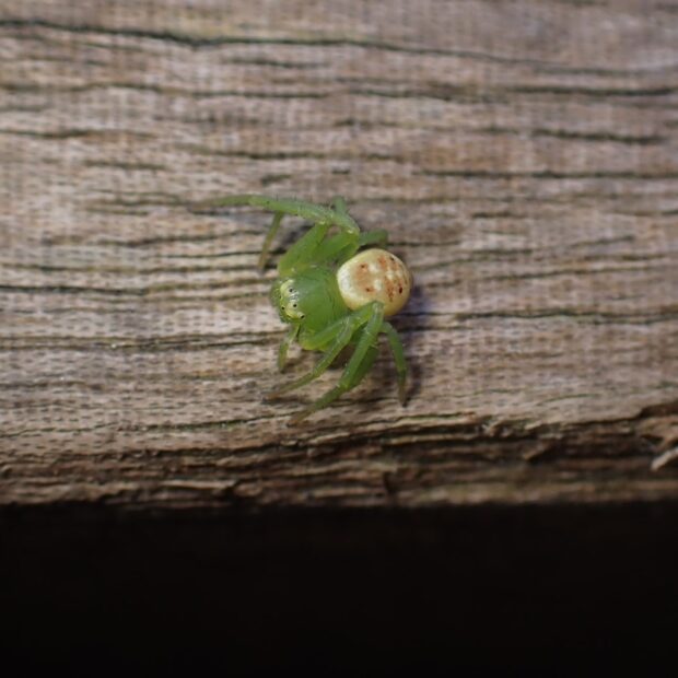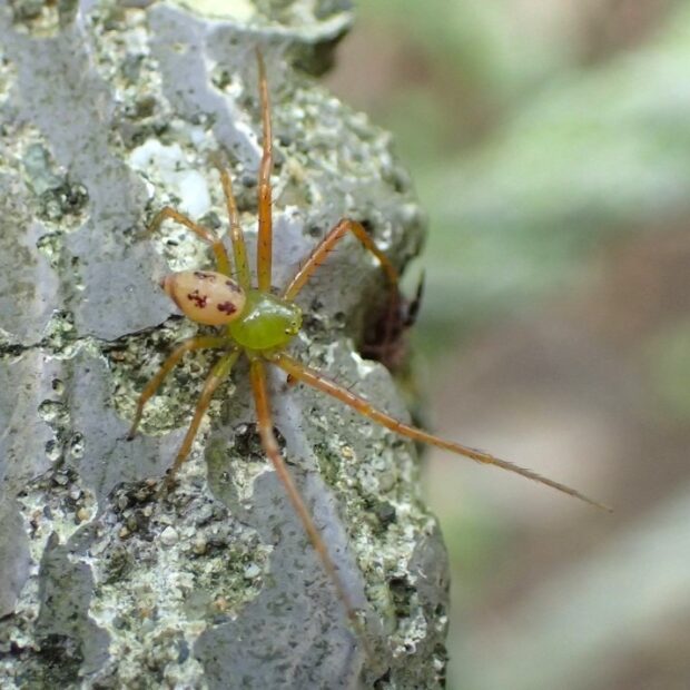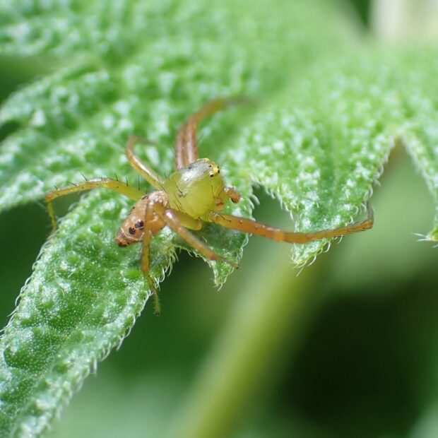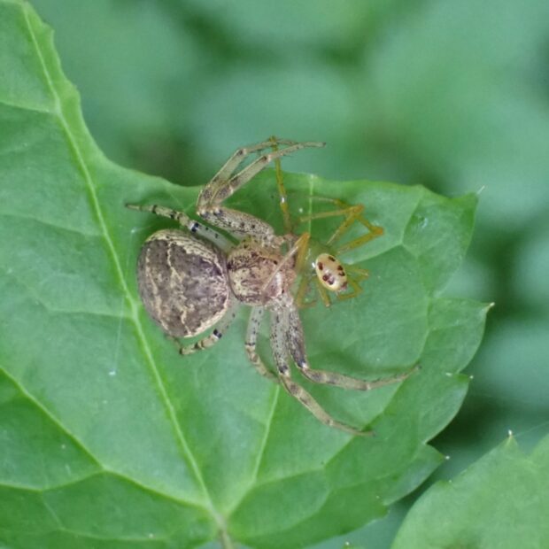 カニグモの仲間。 第1と第2のあしは長く、 あしを広げて、 花や葉の上で待ち伏せをし、 獲物を捕えます。 草地や林縁などで普通に見られます。