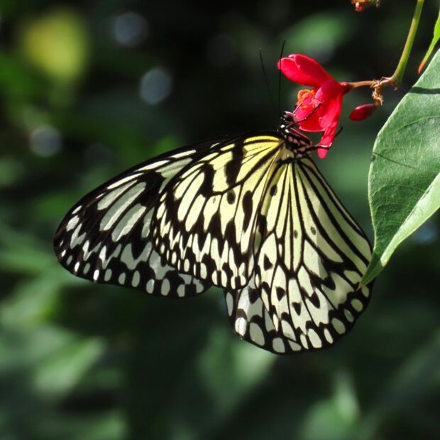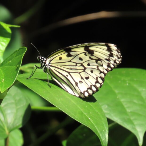 白地に黒いまだら模様が特徴のタテハチョウの仲間。 日中、 フワリフワリとゆっくり滑空するように飛びます。 幼虫は毒を持つ葉を食べることで毒を体内にため込み、 その毒は蛹や成虫にも残っています。 「南国の貴婦人」「新聞蝶」とも呼ばれます。 2020年に沖縄県のチョウに指定されました。
