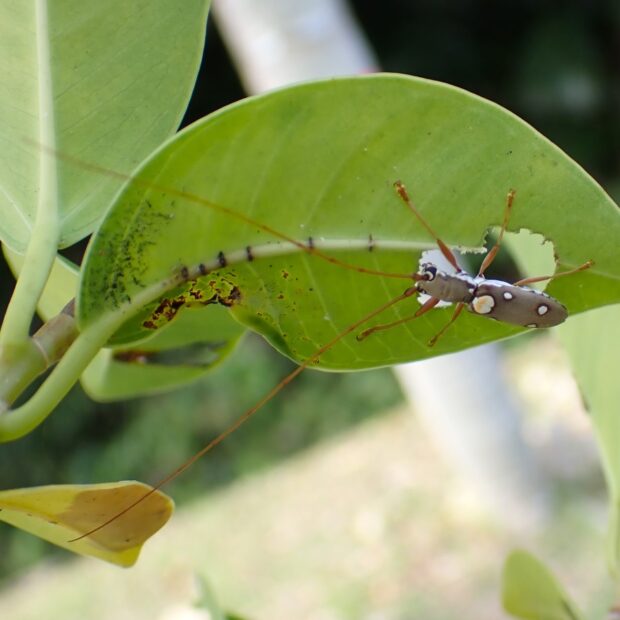 ガジュマルなどの葉に穴をあける南国のカミキリムシ。 体は微毛に覆われつやはなく、 上翅(じょうし)に5つの白い紋があります。 人里近辺のクワ科植物でよく見られ、 葉の裏に潜み、 葉を食べます。