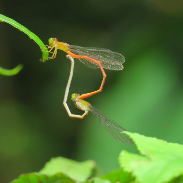 腹部がオレンジ色で複眼が緑色のイトトンボ。 九州では分布域が北上しています。 ベニイトトンボに似ていますが、 本種はほっそりしており、 複眼の緑色味が強く、 メスは腹部先端の背面(第7~10節)に黒色斑があります。 メスはオスと連結して産卵します。