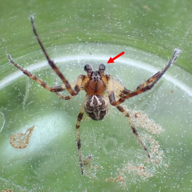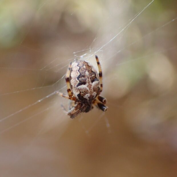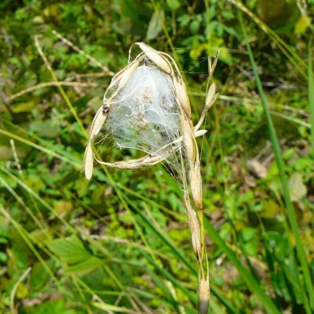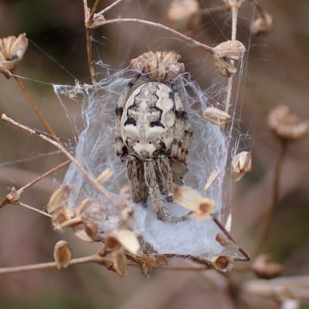 湿地でよく見かける北方系のクモ。 腹部は白っぽいものが多いですが、 全体に薄黒いものもいます。 昼間は草を丸めて作った住みかにいることが多く、 夕方になると、 まるい網を張ります。 名前はクモの研究者の中村正雄氏に因みます。