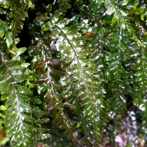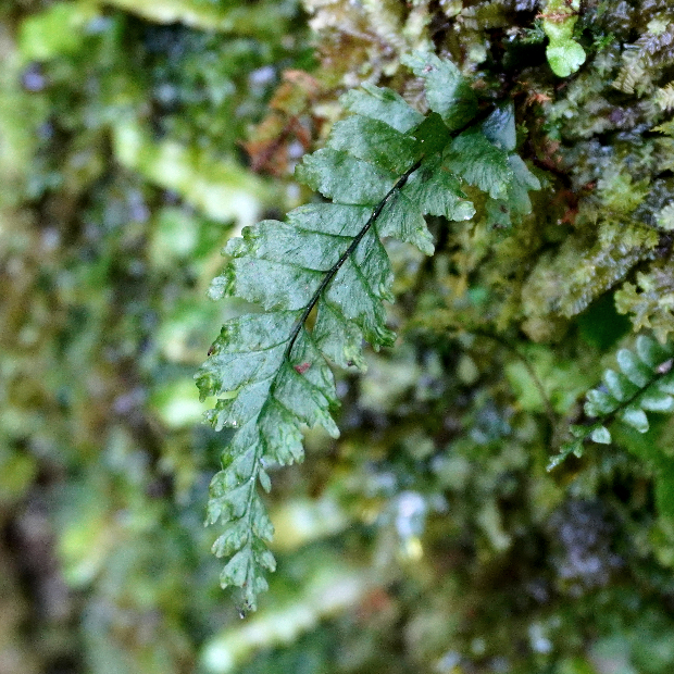 主に水の滴れる崖に生えるホウビシダの仲間のシダ。 このような場所に適応するために、 葉はとても薄い構造をしています。 名前には屋久島とつきますが、 それ以外の地域でも見られます。