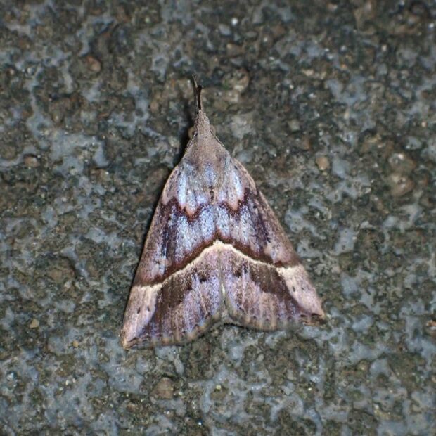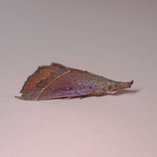 ヤガ科アツバの仲間。 秋になると増え、 街中で普通に見られます。 とまると三角形で、 下唇(かしん)ひげ(パルピともいう)が長く伸びています。 青紫に光るものや、 茶色いものなど変異が見られます。 秋に現れ、 成虫で越冬します。