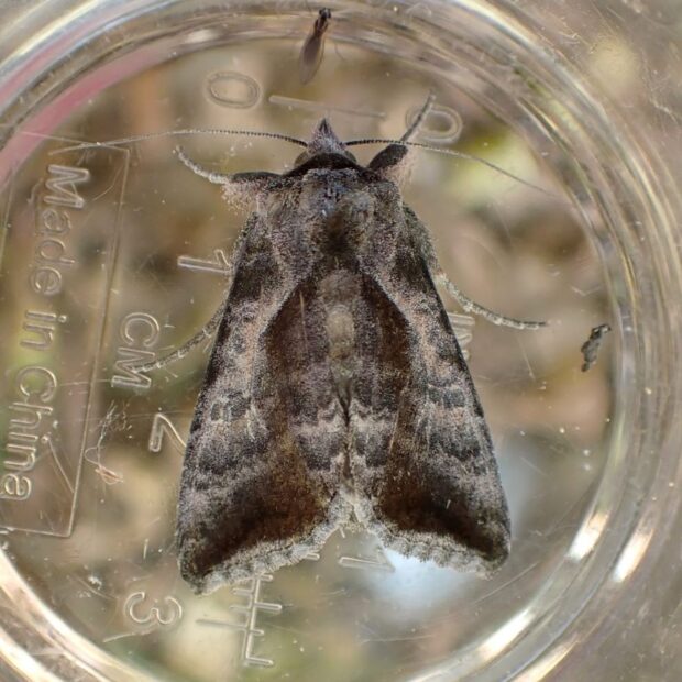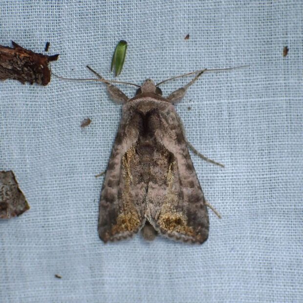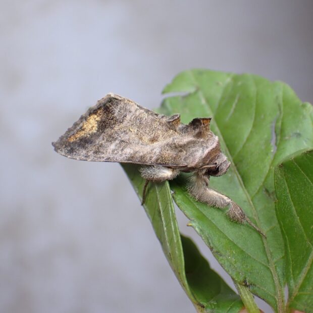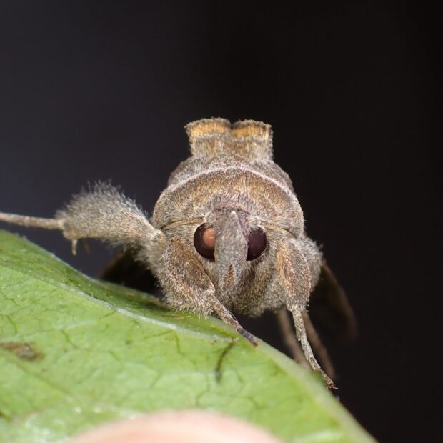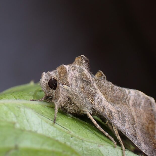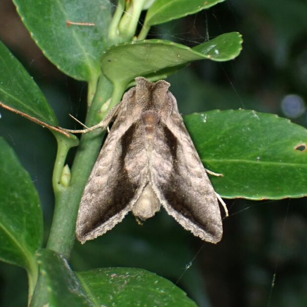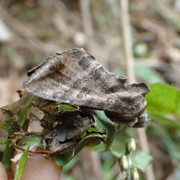 薄暗い所では、 前ばねの紋は黒っぽく見える。