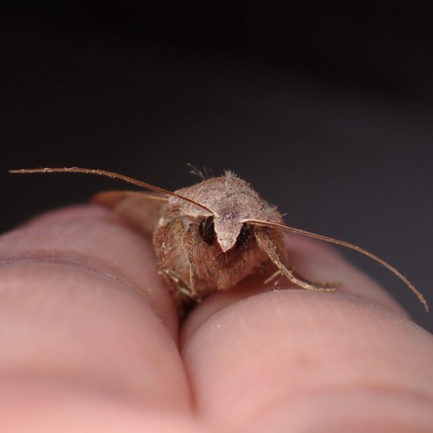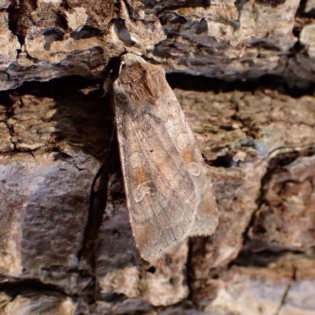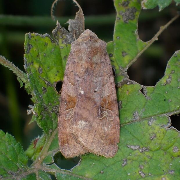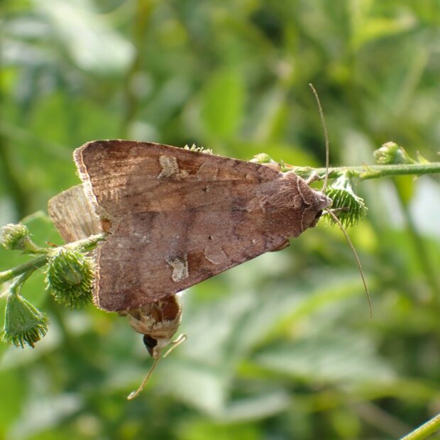 ヤガ科モンヤガの仲間。 茶色のはねに紋がありますが、 色や模様に変異が見られます。 夜行性で明りにやって来ます。 コウスチャヤガに似ており、 識別には注意が必要。 幼虫越冬。