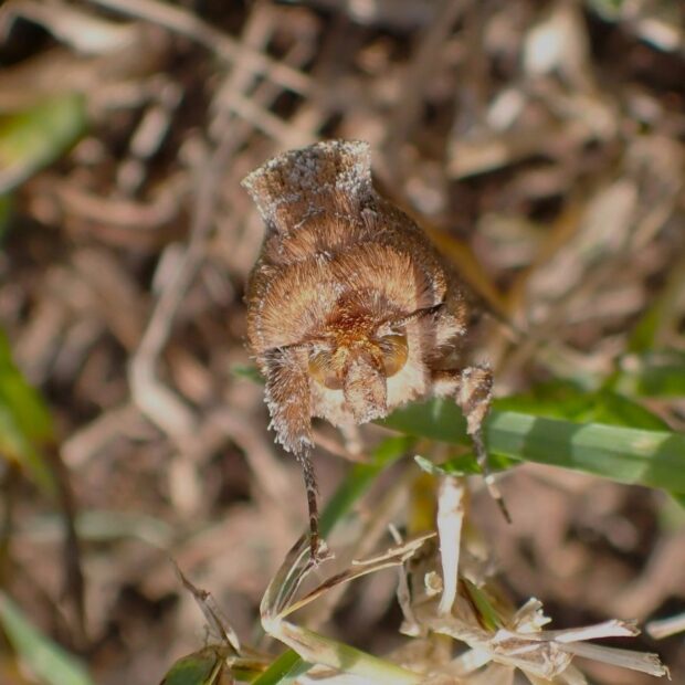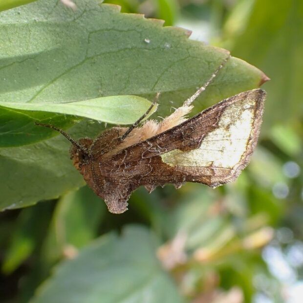 ヤガ科キンウワバの仲間。 茶褐色の前ばねには、 大きな金色の紋があり、 光があたると輝きます。 胸の背には、 トサカのような毛の束が立っています。 都市部などでも普通に見られます。