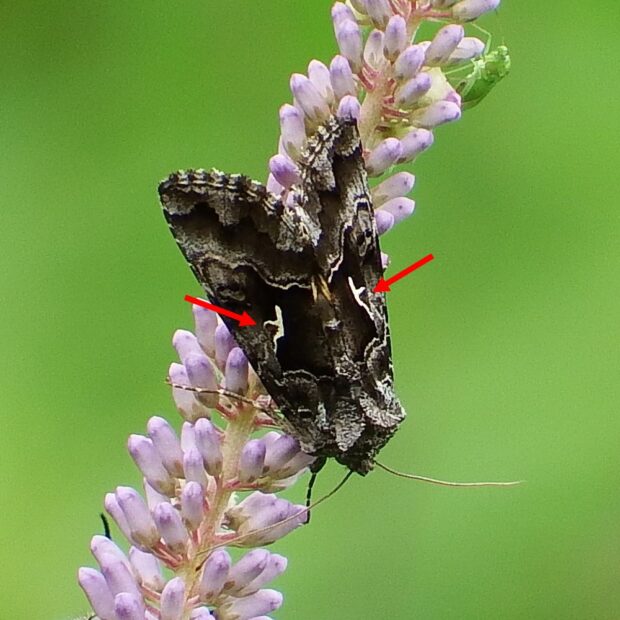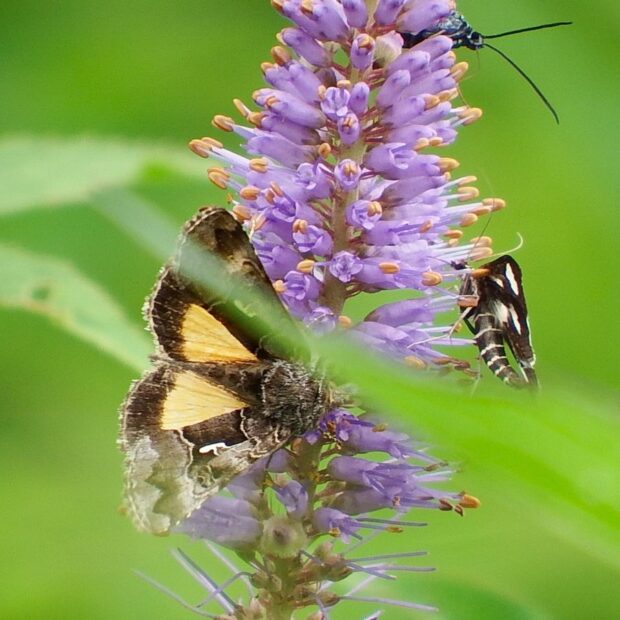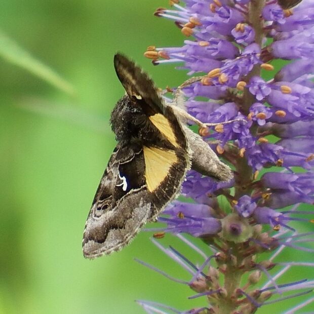 ヤガ科キンウワバの仲間。 昼間によく飛び、 高原の花から花へ忙しそう。 はねを広げると、 後ばねの鮮やかな黄色が目立ちます。 はねを閉じると、 黒っぽい前ばねに、 枝分かれしたクリーム色の紋があります。