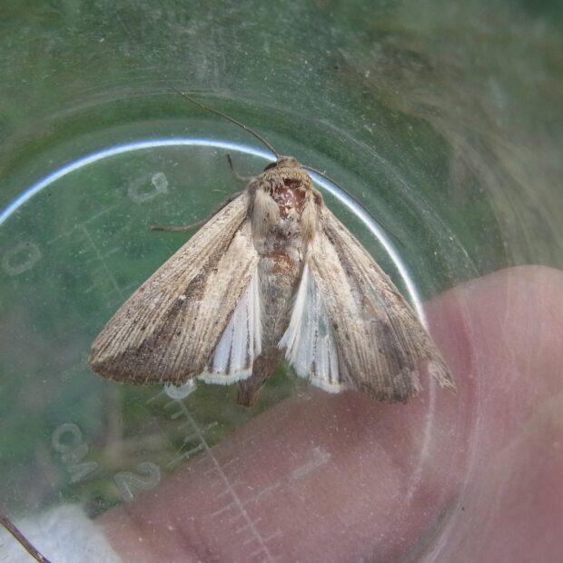 ヤガ科ヨトウガの仲間。 幼虫はイネなどイネ科植物を食べます。 スジシロキヨトウやニセスジシロキヨトウに似ていますが、 本種は、 前ばねの黒点が1列に並び、 後ばねが白いという特徴があります。