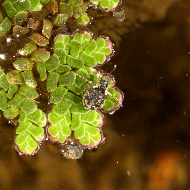 水路、 水田、 ため池などで見られる北米原産のまだら模様の小さなゾウムシ。 日本では1987年に茨城県で発見されました。 各地で大発生している外来種のアゾラ(アイオオアカウキクサなど)を食べることから、 本種の分布が注目されています。