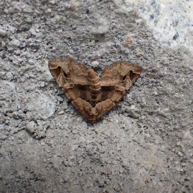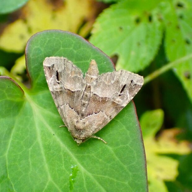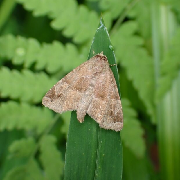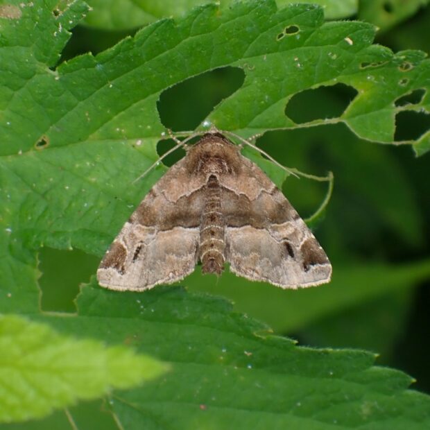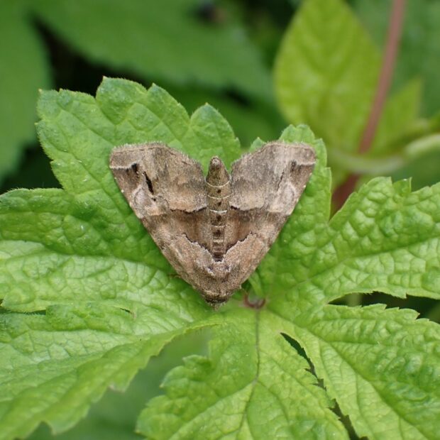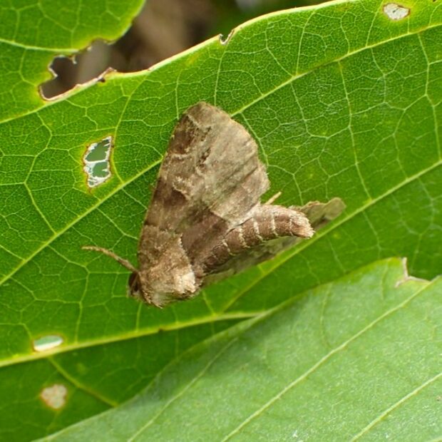 ヤガ科ヒメヨトウの仲間。 カナムグラが生い茂る草地で普通に見られます。 茶色の前ばねの真ん中に濃い茶色の帯があり、 お尻をあげてとまる姿は特徴的です。