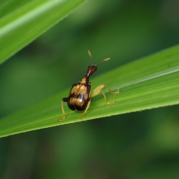 黄褐色の体に濃い色の模様があるオトシブミの仲間。 メスは、 葉をJ字状に切り、 卵を1個産み、 葉を巻いて揺籃を作ります。 幼虫は、 ゆりかごの中で、 葉を食べて育ちます。 オスとメスの形はほとんど変わりません。