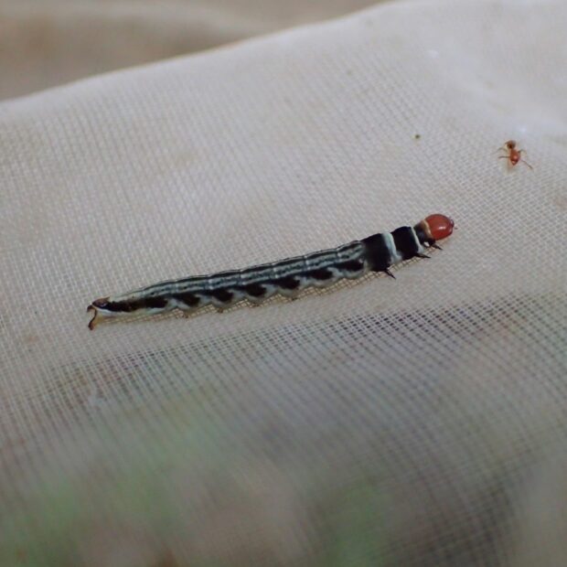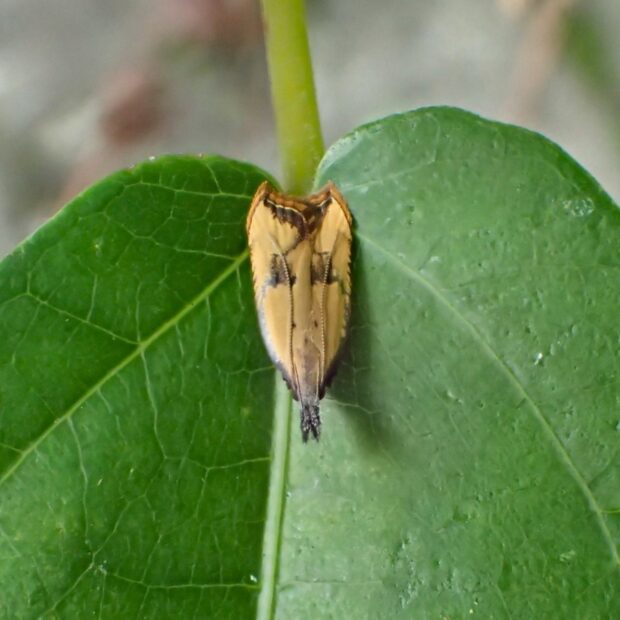 キバガ科フサキバガの仲間。 茶色のはねにこげ茶色の模様がある小さなガ。 頭部にはキバのようなもの(下唇鬚=かしんしゅ)があり、 その下に、 ふさふさした毛の束があります。 明かりにやって来ます。