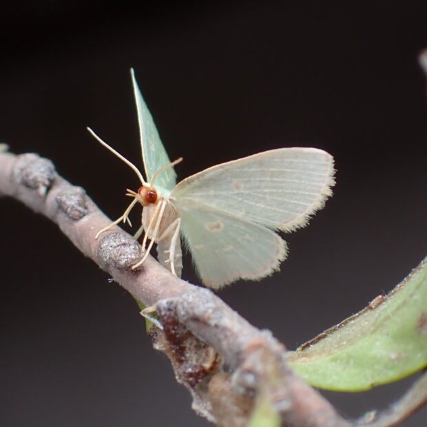 シャクガ科アオシャクの仲間。 淡い緑色の4枚のはねに、 赤い小さな紋がひとつずつあります。 幼虫はいろいろな植物のつぼみ、 花などを食べ、 平地~山地で普通に見られます。 明かりにやって来ます。