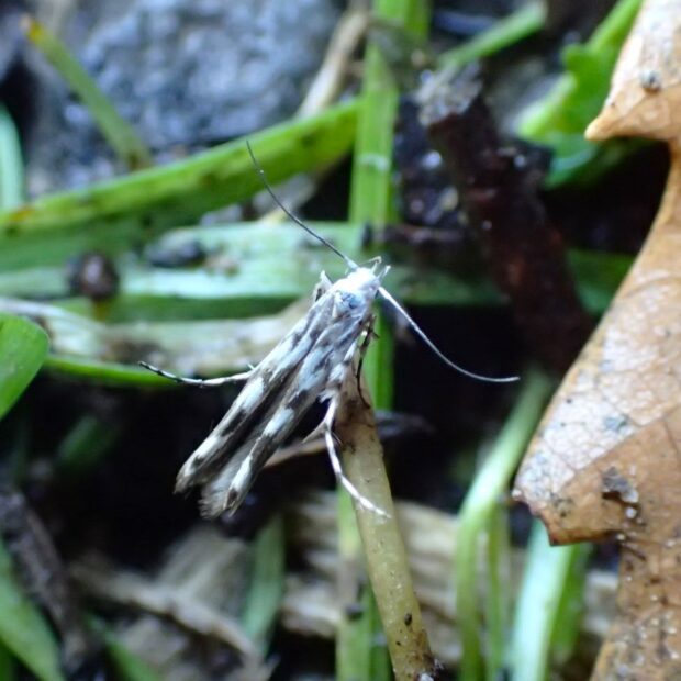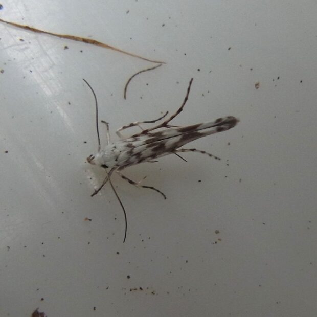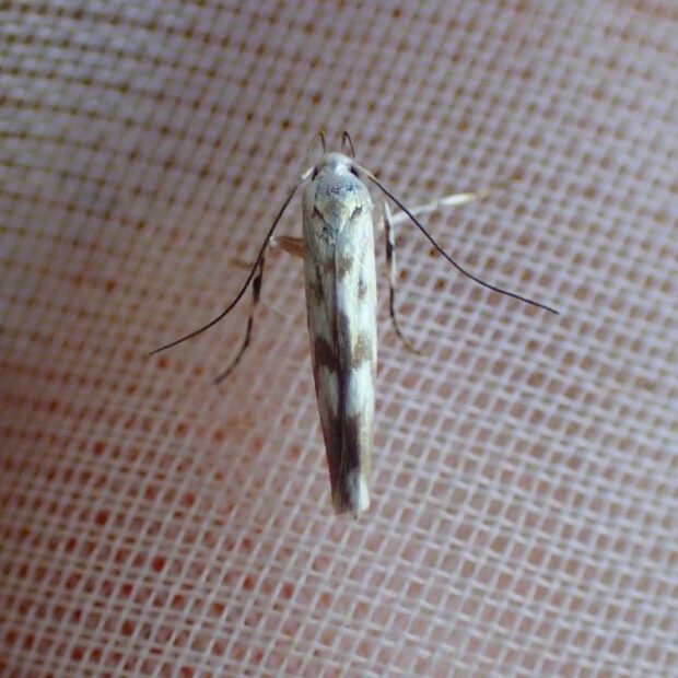 キバガの仲間。 キバガの仲間は頭の先から後ろに突き出たキバのような下唇鬚(かしんしゅ)をもつことが特徴。 白いはねに茶色の模様がある細くて小さなガ。 成虫で越冬します。 モンギンホソキバガは1種として扱われていましたが、 キタモンギンホソキバガとミナミモンギンホソキバガの2種に分かれました。