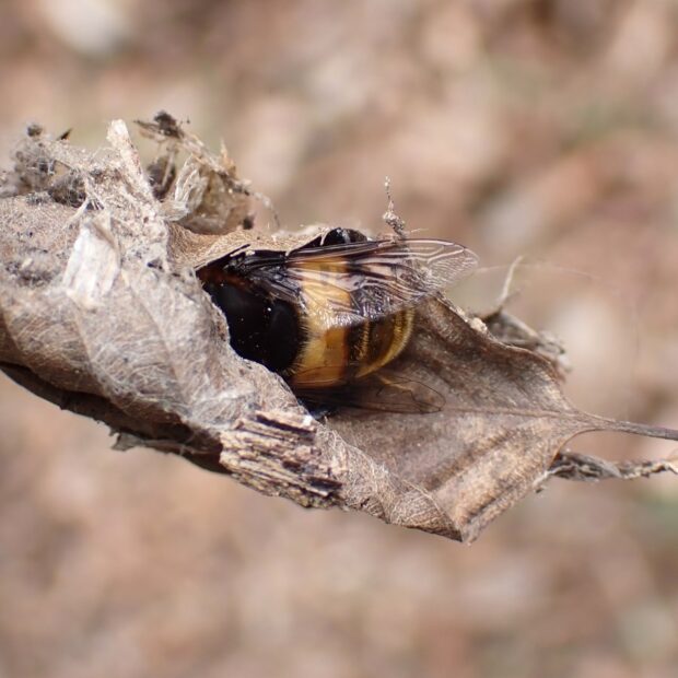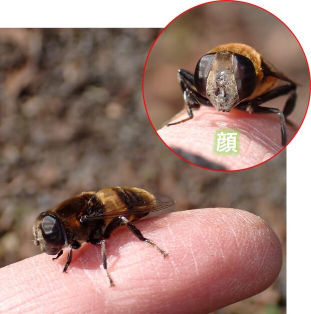 ハナアブの仲間。 体は黒く、 丸っこい腹部には黄色の帯があります。 街中でも普通に見られ、 よく花にやって来ます。 幼虫は水の中で育ち、 オナガウジと呼ばれます。 成虫で冬を越します。