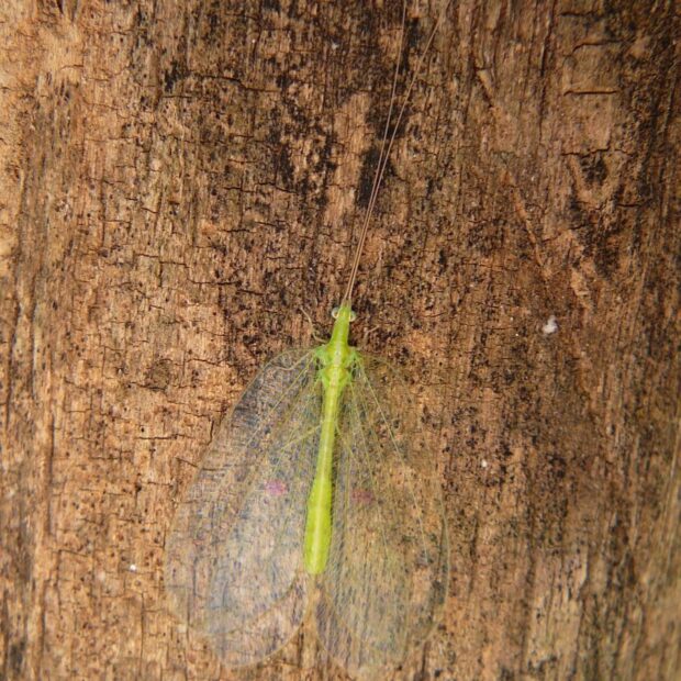 クサカゲロウの仲間。 以前はアミメカゲロウと呼ばれていました。 網目状のレースのような美しいはねをもち、 はねを平らにしてとまります。 はねに黒い紋をもつものも見られます。 冬、 葉の裏に隠れている姿を見ることが多いです。
