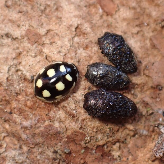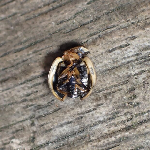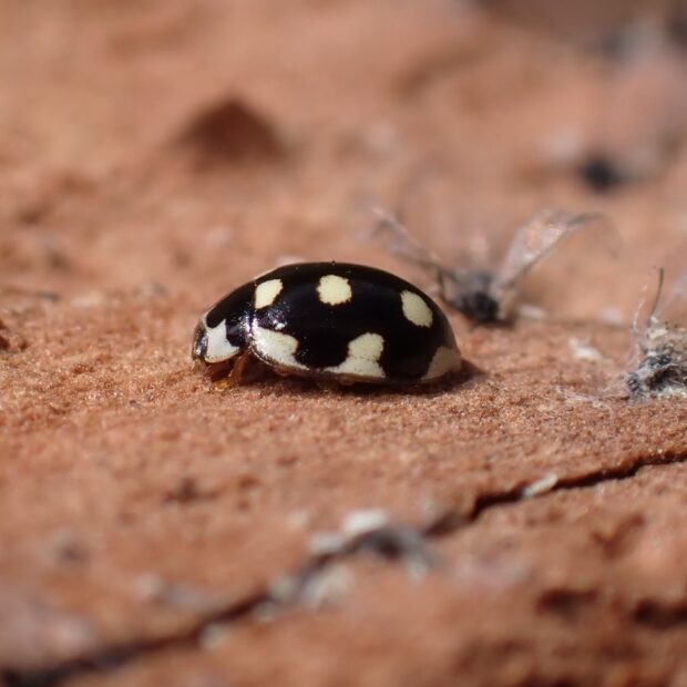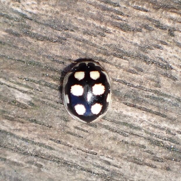 黒いはねに薄い黄色の紋がある小さなテントウムシ。 胸の基部は黒く、 波のような模様(4つの指状の形)が特徴的です。 冬、 ケヤキの樹皮の下で、 越冬している姿を見ることが多いです。