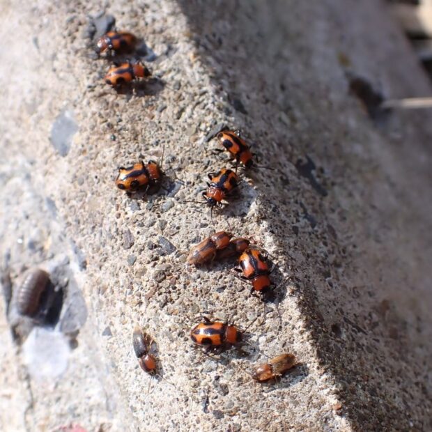テントウムシダマシの仲間。 テントウムシではありません。 オレンジ色の体に4つの黒い紋が特徴的。 石の下や植物の根際、 朽ち木などで普通に見られます。 石の下などで、 成虫が集まって越冬することがあります。