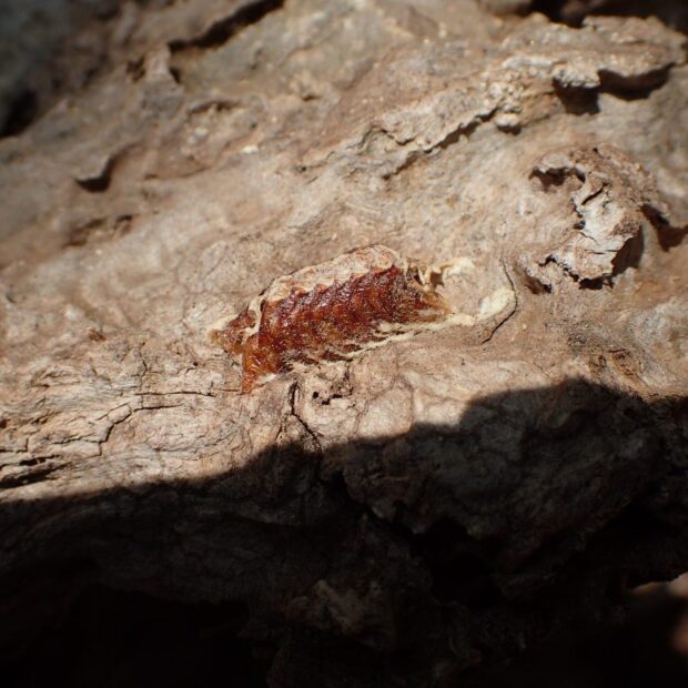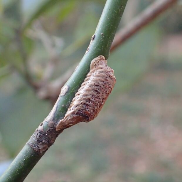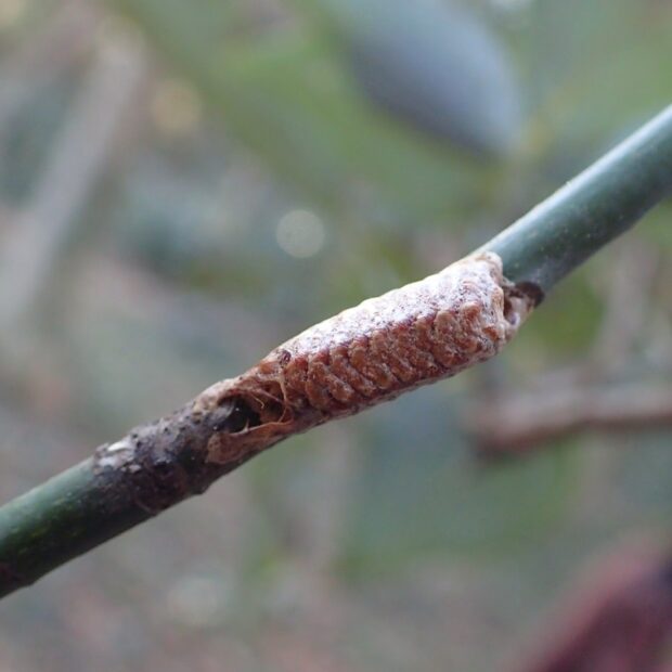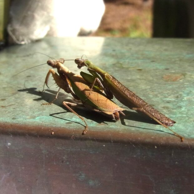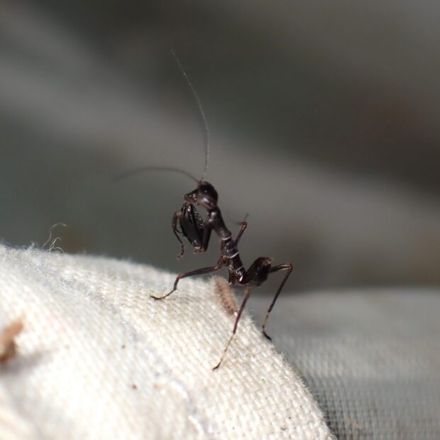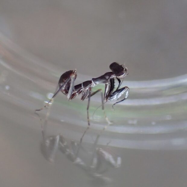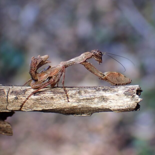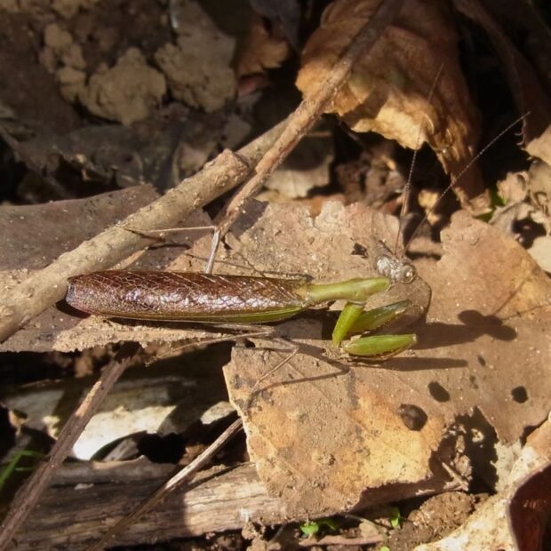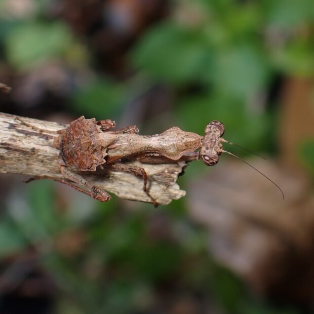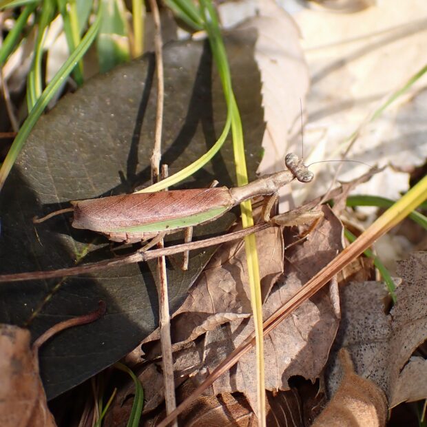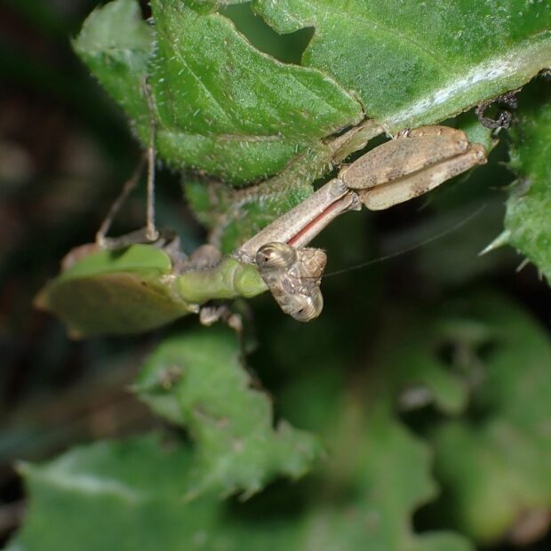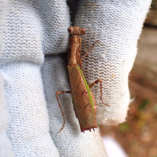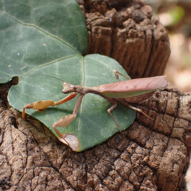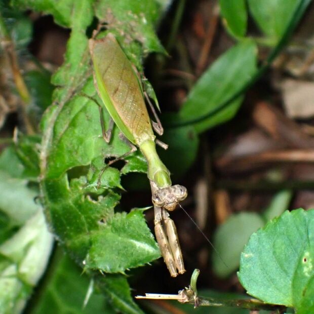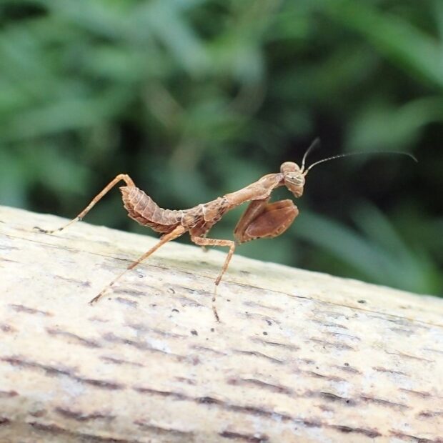 ハナカマキリの仲間。 緑色と茶色の小さなカマキリ。 雑木林や照葉樹林の林縁部などの樹上にいることが多く、 危険を感じると、 地表に落ちて死んだふりをします。 夜、 明かりにやって来ます。