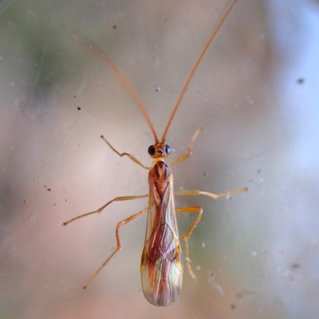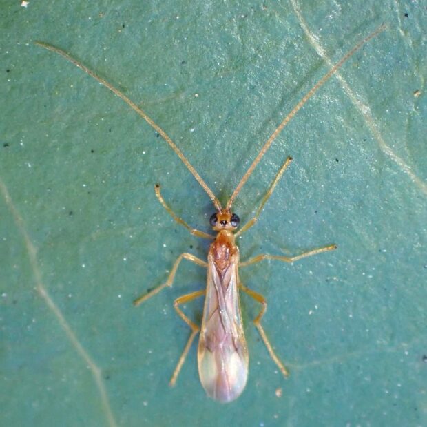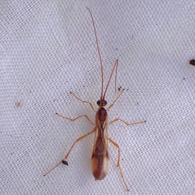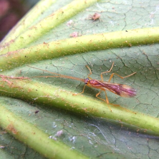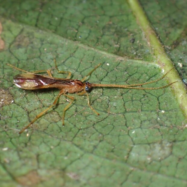 コマユバチの仲間。 スズメガの幼虫などに寄生する寄生バチ。 冬、 広葉樹の葉の裏で見かけることが多いです。