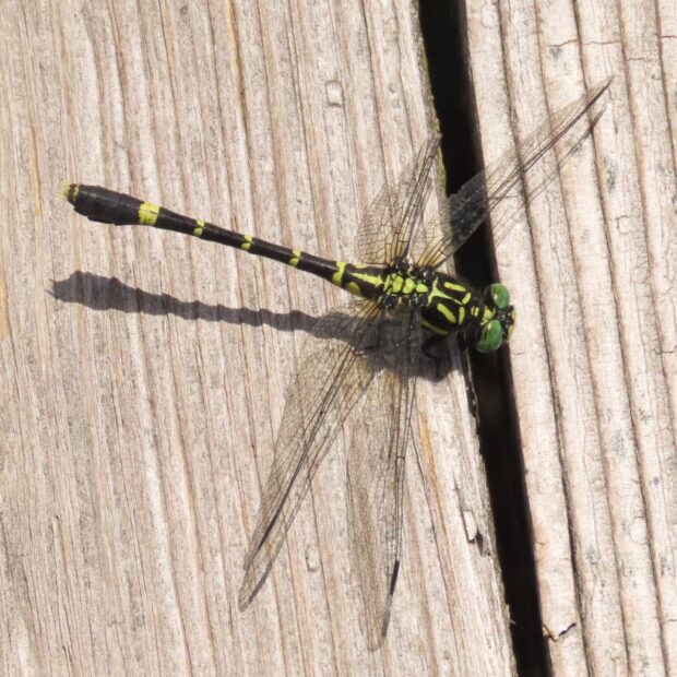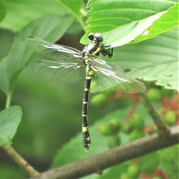 樹林に囲まれた川の上~中流域で見られる中型のサナエトンボ。 オスは腹部の先端の尾部付属器(びぶふぞくき=メスと連結するとき頭の後ろをはさむもの)が黒くて大きく長いのが特徴です。 これが名前の由来になっています。 川で羽化すると、 近くの林に移動して過ごします。