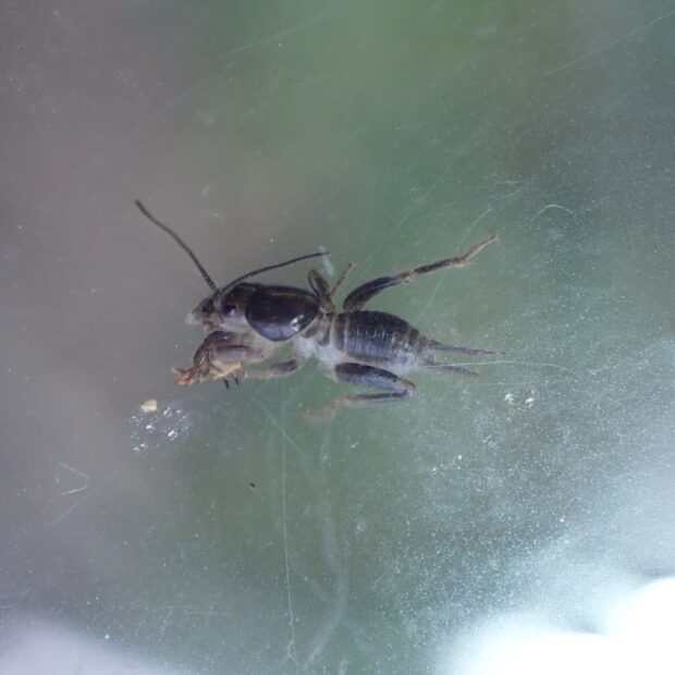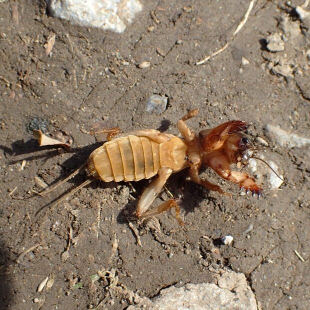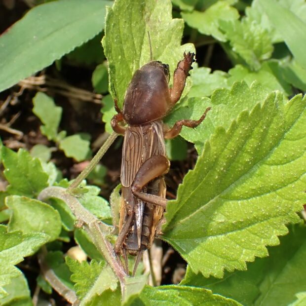 ケラ科。 コオロギに近い仲間。 金色の短いビロードのような毛でおおわれ、 シャベルのような前あしが特徴。 草はら、 田んぼ、 畑など湿った土に潜って地中で生活しています。 昔から「オケラ」と呼ばれ親しまれてきました。 初夏、 オスもメスも「ジー」「ビー」と鳴きますが、 以前はミミズの鳴き声と思われていました。