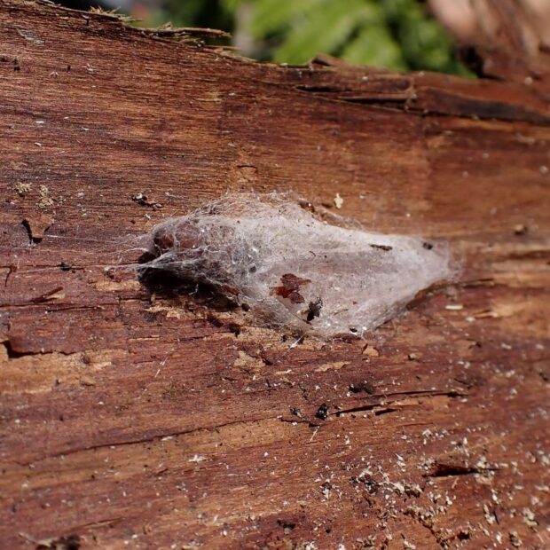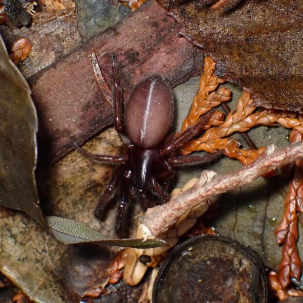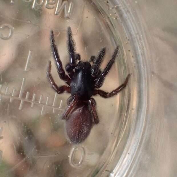 エンマグモの仲間。 全身光沢のある黒褐色をしており、 細かい毛が生えています。 樹林地や神社などで見られますが、 目につくことは少ないです。 スギやヒノキなどの樹皮の割れ目や樹皮の下、 岩の割れ目などに、 入り口に糸を引いた管状の住みかを作ります。