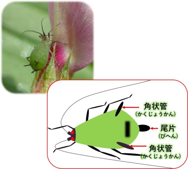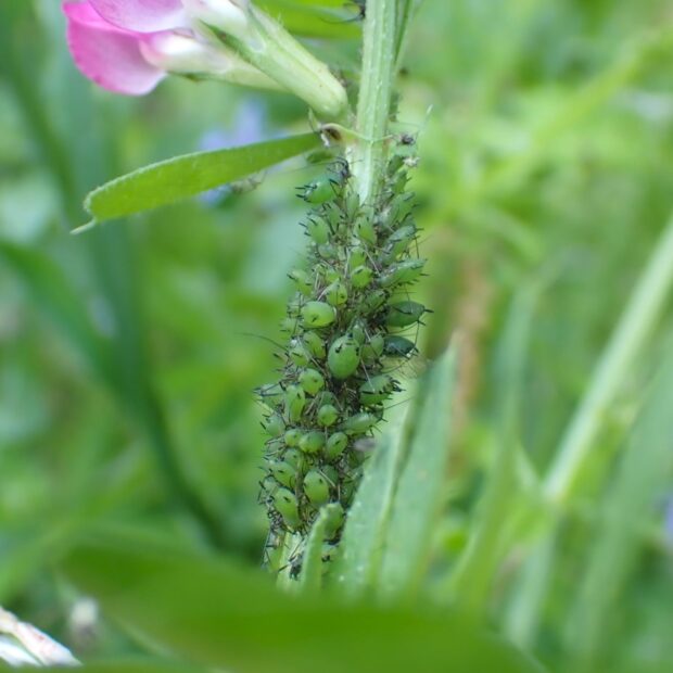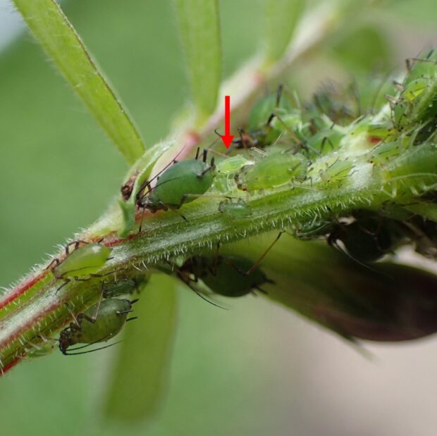 ソラマメやカラスノエンドウなどで集団生活をするアブラムシ。 春~夏、 メスは数世代にわたり、 交尾をせずに幼虫を産み、 どんどん増えていきます。 秋になるとオスが生まれてメスと交尾をし、 メスは卵を産みます。