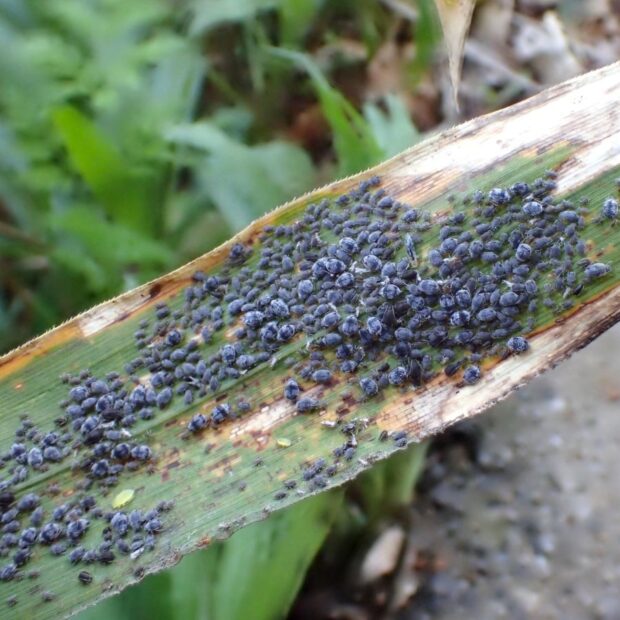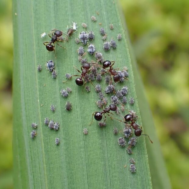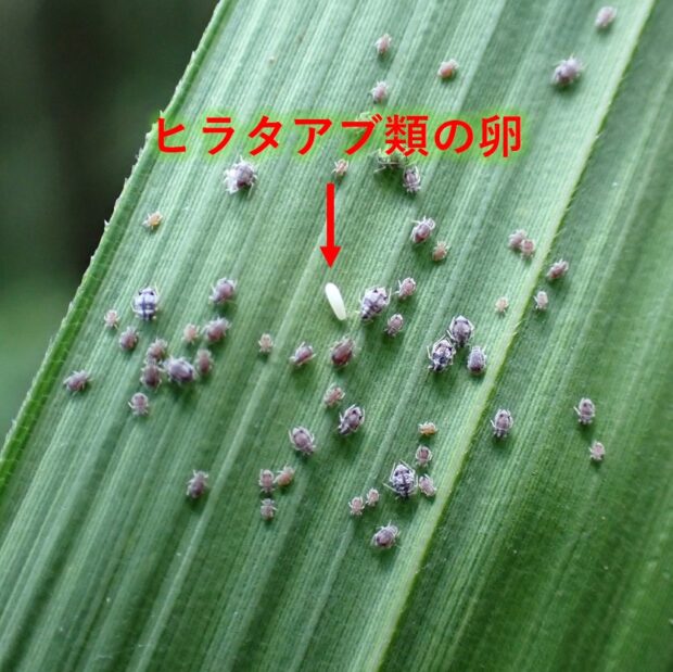 アズマネザサの葉の裏で、 普通に見られる丸っこいアブラムシ。 「カマツカ」に移るものと、 一年中アズマネザサで生活をするものがいます。