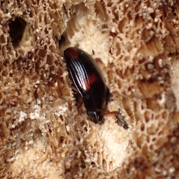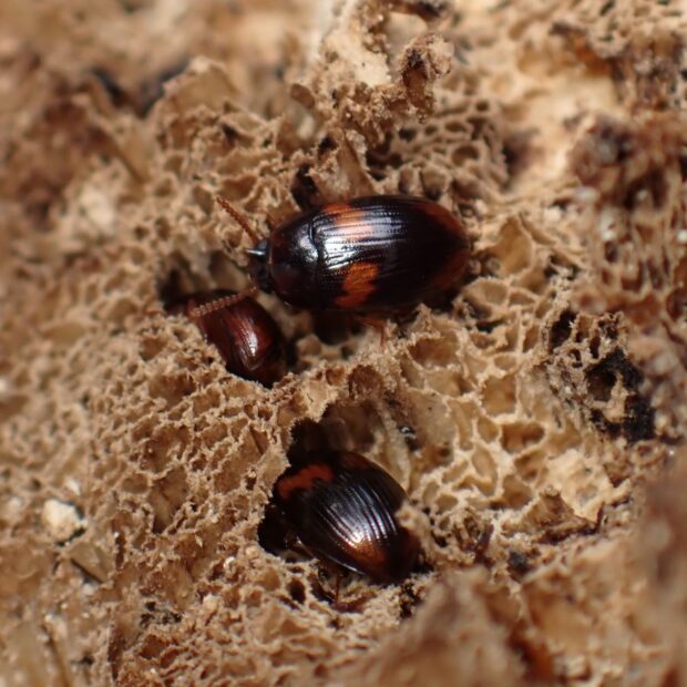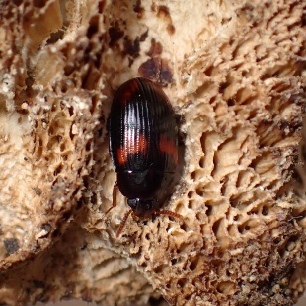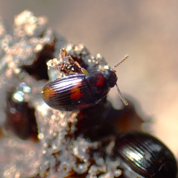 キノコゴミムシダマシの仲間。 倒木や朽ち木に生えるカワラタケなどのキノコで見られます。 光沢のある黒い体に赤い紋があります。 オスは頭部に1対の突起があり、 右のみが大きく先端に黄色い毛が生えています。 暖地では街中の街路樹でも見られることがあります。