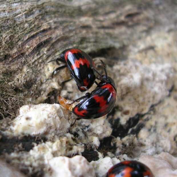 倒木のカワラタケなどで見られるキノコゴミムシダマシの仲間。 体色は黒く光沢があり、 上翅(じょうし)に赤い模様がありますが、 色や紋に地理的な変異が見られます。 メスはキノコに産卵し、 幼虫もキノコを食べて育ちます。