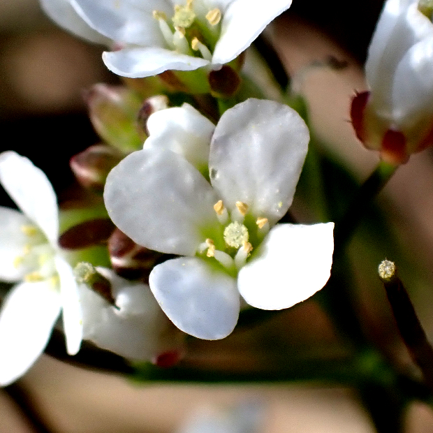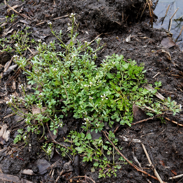 春の里山の田んぼで普通に見られるアブラナ科。 花弁が4枚の白く小さな花、 細長い果実、 丸みがあるように切れ込んだ羽状の葉などが特徴です。 茎葉は天ぷらやお浸しとして食べることもできます。
