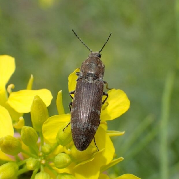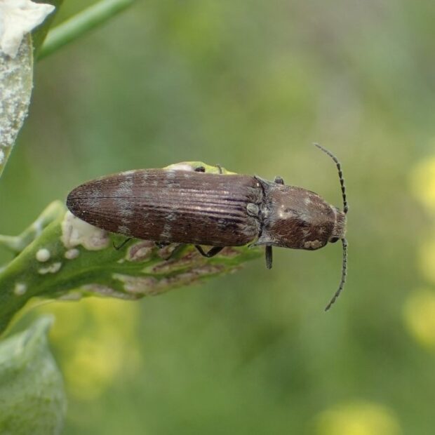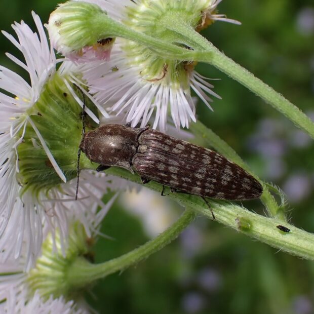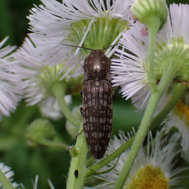 葉や花の上で見られるしもふり模様のコメツキムシ。 体は銅色で、 灰色の毛が斑紋のようになっています。 似た種類は多く、 識別には注意が必要。