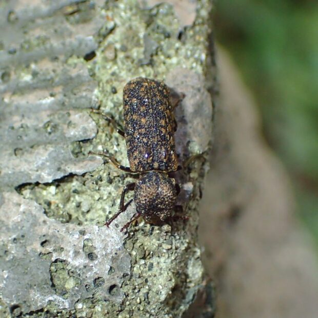 枯木に集まるナガシンクイムシの仲間。 ゴツゴツした筒状の体で、 頭部は下向きについています。 メスは枯れ木の内部(材)に産卵し、 幼虫は材を食べて育ちます。 明かりにやって来ます。