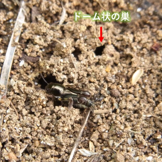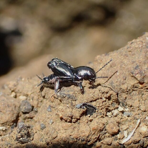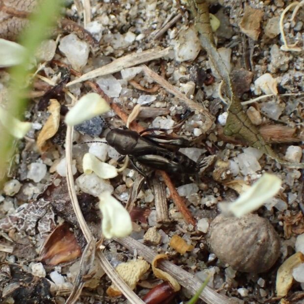 やや湿った裸地で見られるノミバッタ科の仲間。 メタリックに黒光りした小さな体。 後あしが太く、 名前の通り「ノミ」のようによく跳ねますが、 飛翔することはできません。