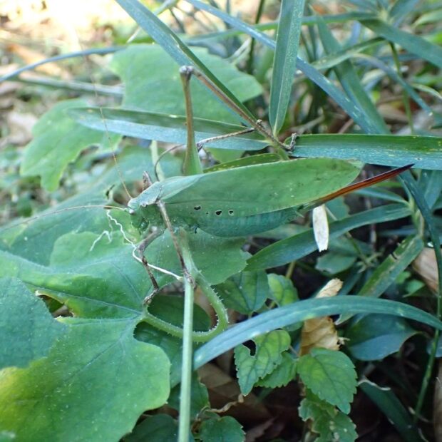林縁のクズ群落などで見られるクツワムシ科の仲間。 大形で、 褐色型と緑色型がいます。 夜行性で、 夜、 大きな声で鳴きます。 近年、 生息地は減少しています。
