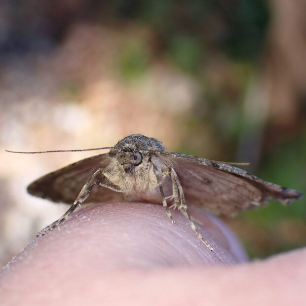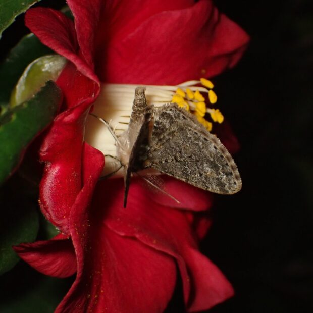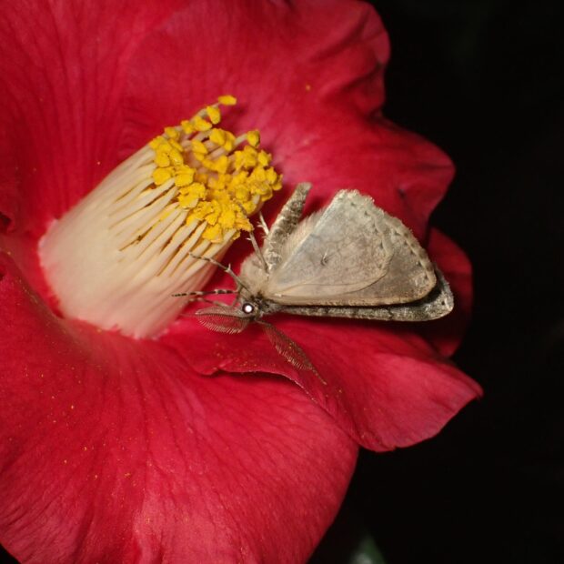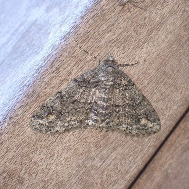 地味な色で、 白い紋があるエダシャク。 色や模様はいろいろで変異が見られます。 触角は、 オスはくし歯状で、 メスは糸状。 冬から早春にかけて普通に見られます。
