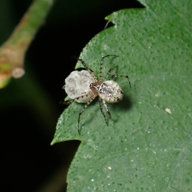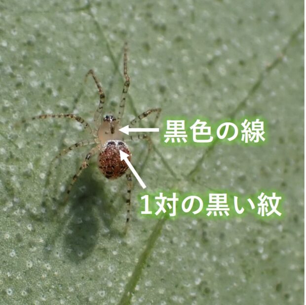 クモを襲うヒメグモの仲間。 都市部から山地まで広く生息し、 木の葉裏などで普通に見られます。 腹部前方の2個の黒い紋と、 頭胸部の黒い筋が特徴。 葉や枝を歩き回り、 クモに粘球のある糸を投げかけて捕えます。