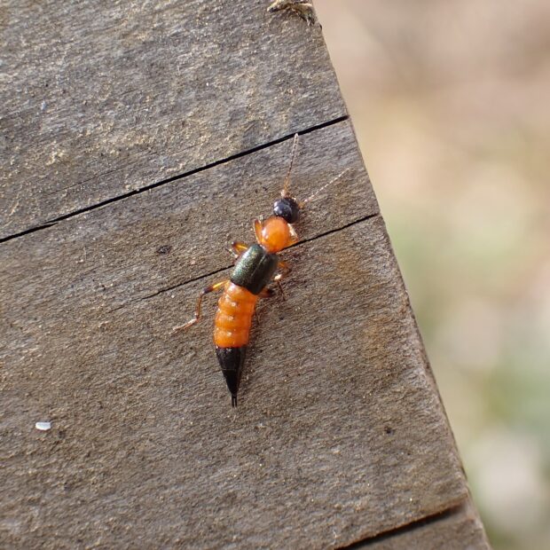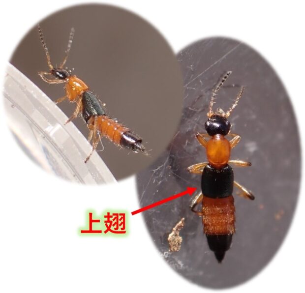 オレンジと黒の小さなハネカクシ。 田んぼや湿った草地の植物の根元や石の下などで、 普通に見られます。 上翅(じょうし)が青いことから「アオバ」と名づけられました。 成虫はよく飛び、 明かりにやって来ます。