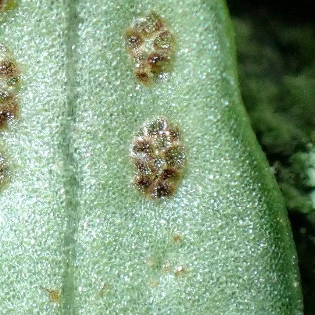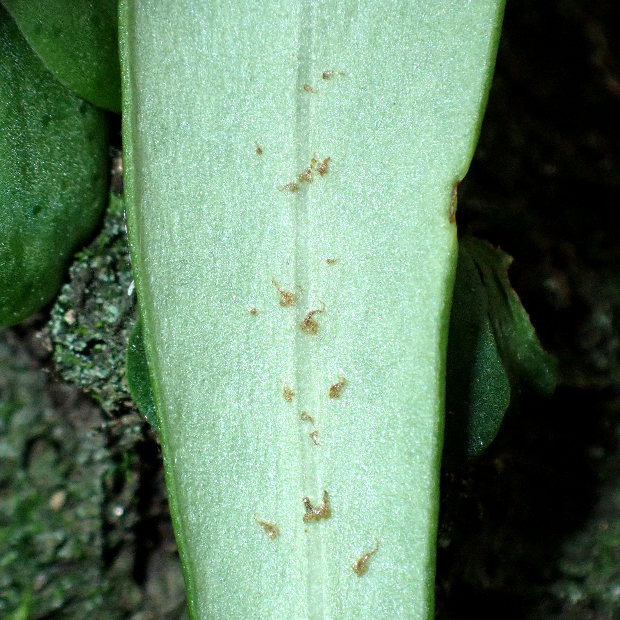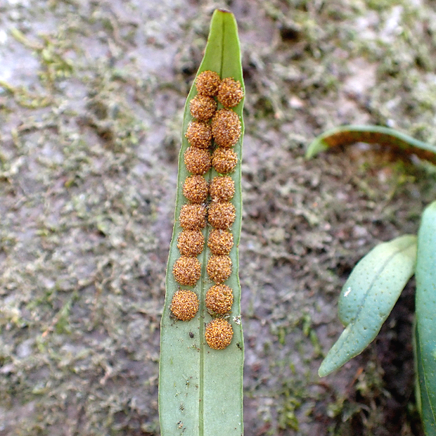 木の幹などから葉を垂らすシダ。 葉裏に大きな丸い胞子のう群を2列につけます。 近縁のノキシノブによく似ていて、 本種の方が根茎先から密に葉を出し、 葉がやわらかめで葉幅が広くなりますが、 特に小さな株の野外での区別は難しいです。 関東から東海にかけて多く分布するといわれています。