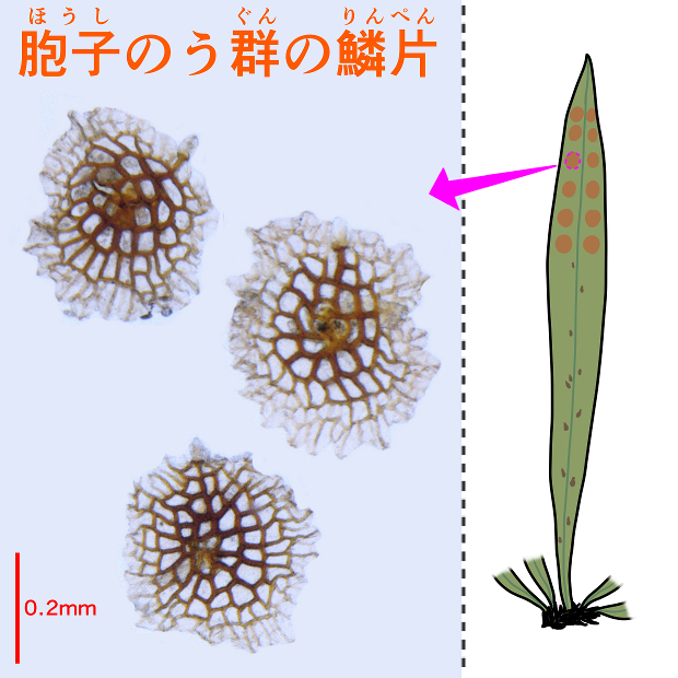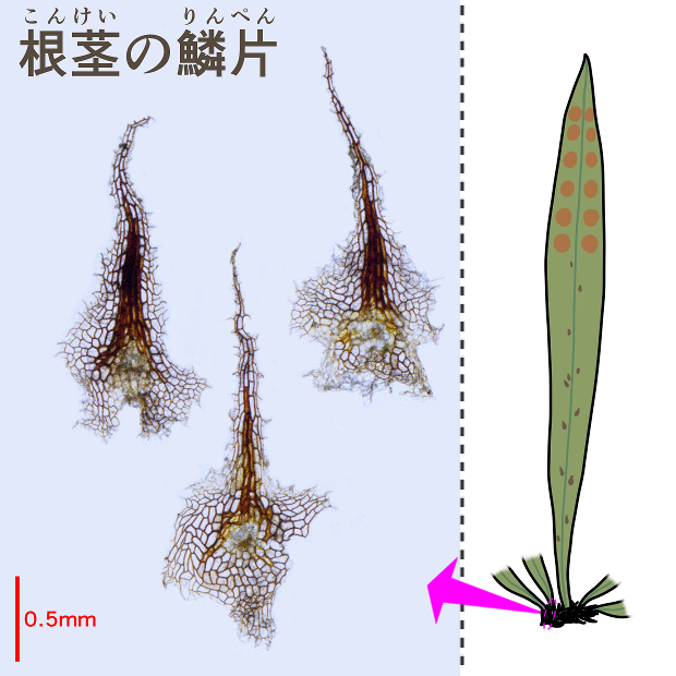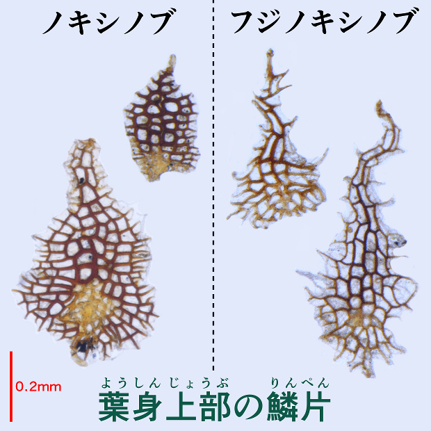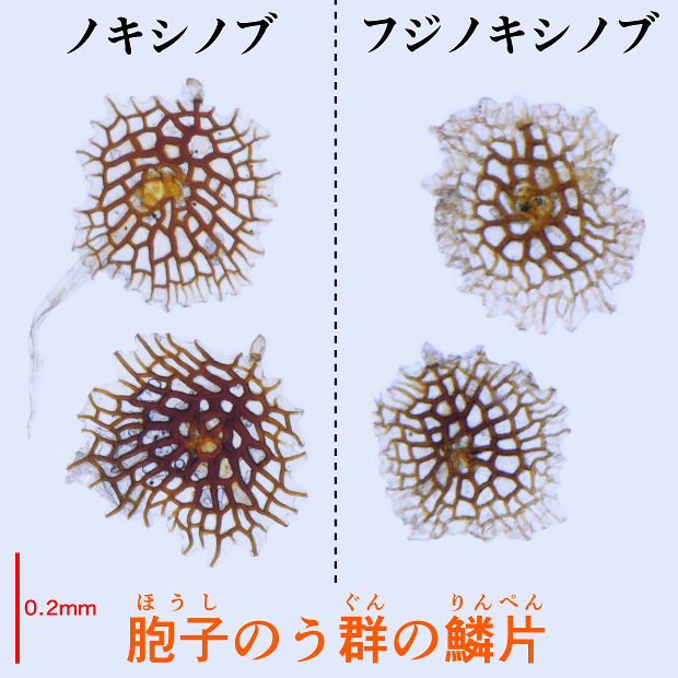 基本的にノキシノブと見分けるには、 フジかな?と見当をつけてからルーペまたは顕微鏡で鱗片の観察が必要となります。 しかし、 それでもたくさんの標本を顕微鏡で観察して経験を積まないと難しく、 雑種もあります。 さらに、 葉柄が緑色のクロノキシノブの存在が明らかとなっているうえに、 最近になってノキシノブから分けられる形でタジマノキシノブが知られるようになるなど、 一般目線での分類がとことん難しくなりつつあります。 従って、 特別分ける必要がない限り、 わざわざこれらを区別せずにノキシノブ(広義)としちゃうのも1つの手です。